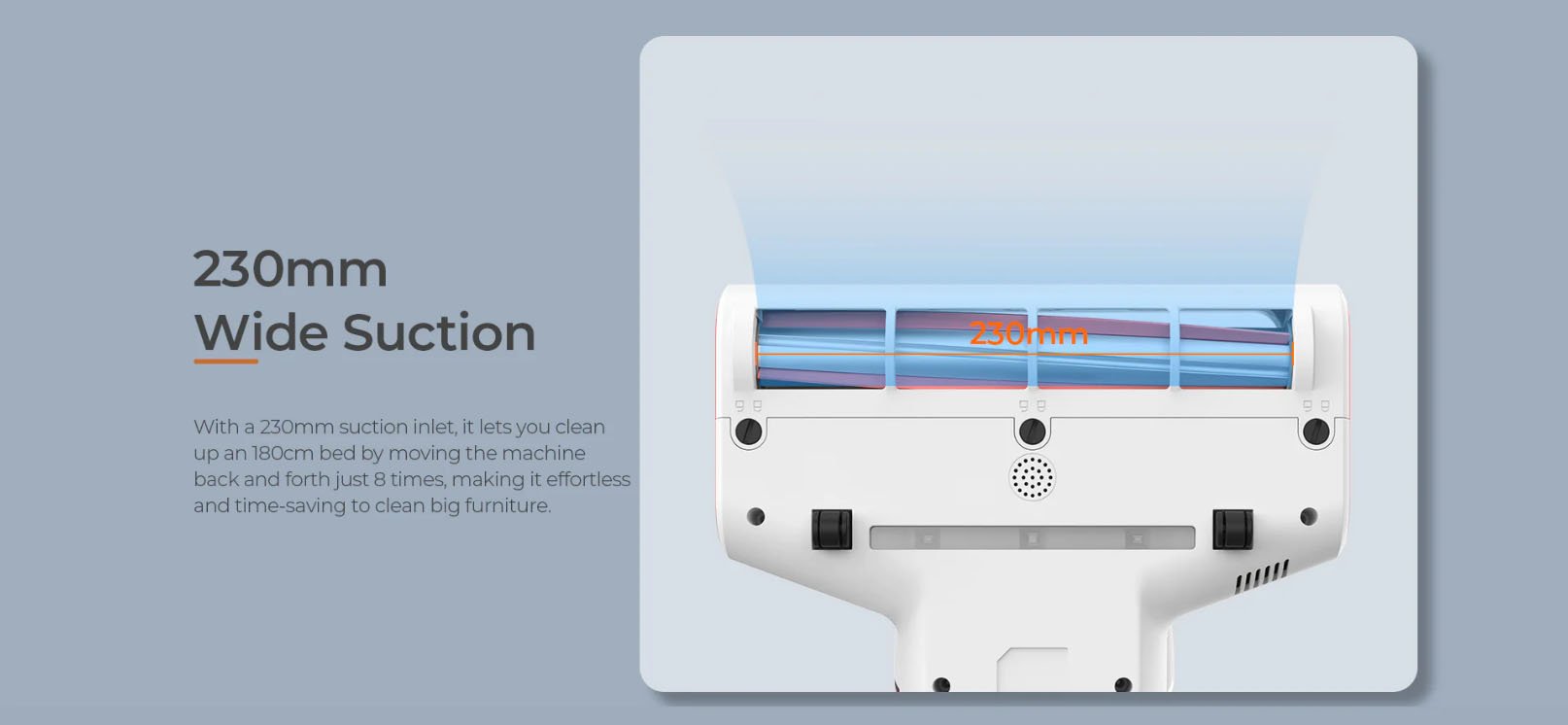 500 W motor odlikuje visoka učinkovitost, močno sesanje in velika vzdržljivost. Z močjo 500 W in sesalno močjo 13 KPa vam Smarock S10 zagotavlja globinsko in učinkovito čiščenje. Z 230 mm sesalno odprtino vam čistilni stroj S10 omogoča preprosto in brez truda čiščenje velikega pohištva, kot so velike postelje in dolge zofe.