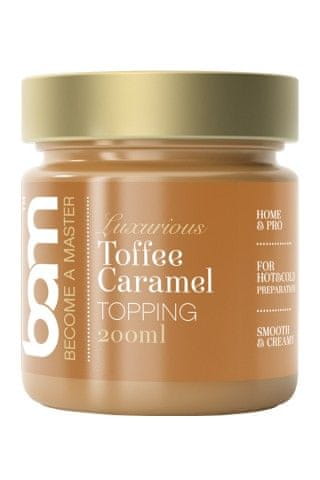 BAM preliv Toffee karamel je pripravljen s kakavovovim maslom, ki ustvari kremno strukturo. Primeren je kot preliv za sladoled, polnilo, dodatek k palačinkam in za pripravo različnih sladic. Izdelek je brez glutena.