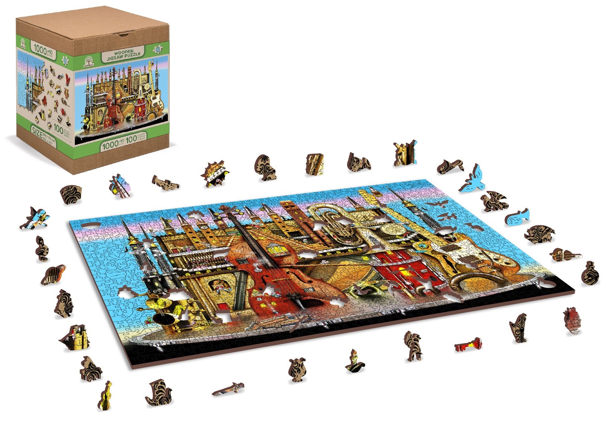 Lasersko izrezana lesena sestavljanka WOODEN CITY s svojimi posebej oblikovanimi kosi je neverjetno zabavna. Nekateri kosi so narejeni v obliki živali, zgradb ali predmetov, katerih učinek je okrepljen z lasersko izboljšanimi detajli. Ti deli lahko stojijo sami kot majhne figurice. Sestavljanje sestavljanke z različno oblikovanimi kosi je težje in predstavlja večji izziv kot sestavljanje klasične sestavljanke. Poleg tega je sestavljanka obojestranska, sestavljate jo lahko tako po sliki (prednja stran) kot po obliki (zadnja stran z vzorcem). Poleg edinstvenega koncepta sestavljanke blagovna znamka WOODEN CITY ne pozablja na ekologijo, zato pri teh izdelkih ne boste našli plastične embalaže.