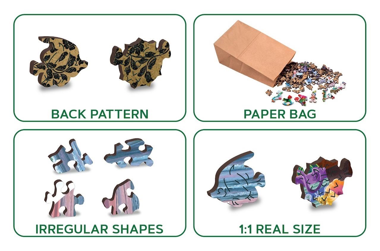 Lasersko izrezana lesena sestavljanka WOODEN CITY s svojimi posebej oblikovanimi kosi je neverjetno zabavna. Nekateri kosi so narejeni v obliki živali, zgradb ali predmetov, katerih učinek je okrepljen z lasersko izboljšanimi detajli. Ti deli lahko stojijo sami kot majhne figurice. Sestavljanje sestavljanke z različno oblikovanimi kosi je težje in predstavlja večji izziv kot sestavljanje klasične sestavljanke. Poleg tega je sestavljanka obojestranska, sestavljate jo lahko tako po sliki (prednja stran) kot po obliki (zadnja stran z vzorcem). Poleg edinstvenega koncepta sestavljanke blagovna znamka WOODEN CITY ne pozablja na ekologijo, zato pri teh izdelkih ne boste našli plastične embalaže.