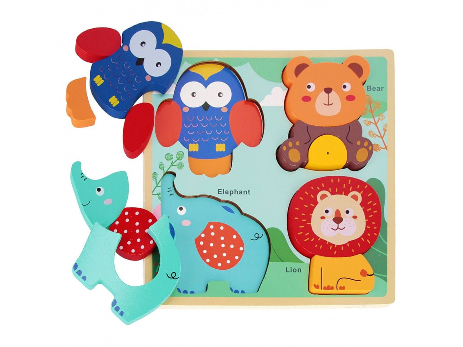 Komplet vsebuje prijazne živali, kot so sova, medved, slon in lev, ki jih lahko ujemate z izrezanimi oblikami na plošči.