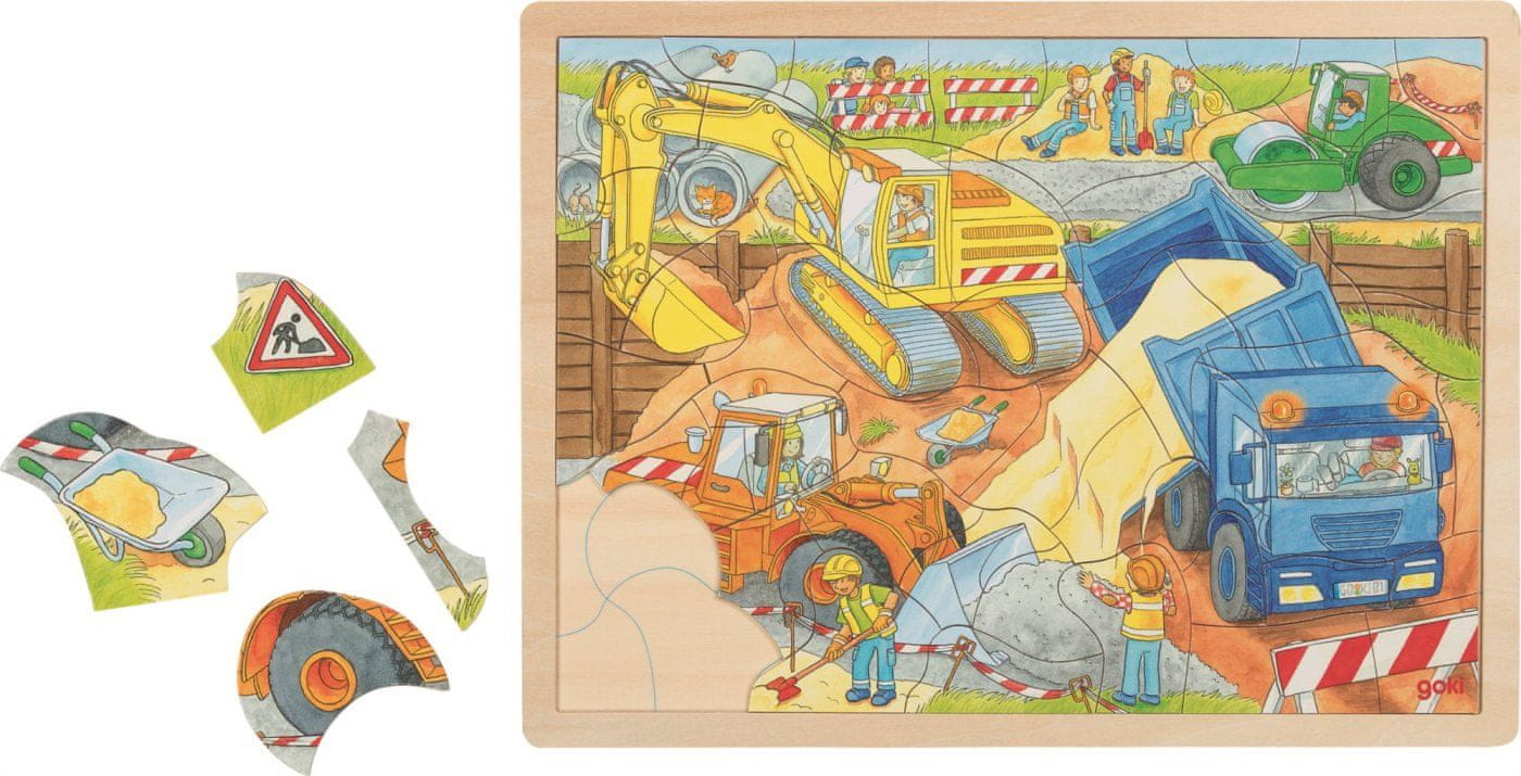 Otroška sestavljanka iz lesa z motivom živahnega prizora na gradbišču. Deli so položeni na leseno ploščo z izrezanim obrisom za lažje sestavljanje. Sestavljanka nima standardne oblike kosov, kot jih poznamo iz klasičnega sestavljanja, temveč je slika sestavljena iz nepravilnih kosov brez ključavnic, kot da bi jo nekdo razbil. Zlaganje sestavljank razvija domišljijo in spodbuja motorični razvoj. Priporočljivo za otroke od 3. leta starosti dalje. GOKI je eden najpomembnejših evropskih proizvajalcev igrač visoke pedagoške in didaktične kakovosti. Podjetje poudarja varnost igrač, njihovo zdravstveno varnost in skrbi za obnovljive vire. Les se vzame tam, kjer lahko raste. Uporabljajo se javor, bukev, oreh, lipa, jesen, bor, breza in kavčukovec. Barve in laki izvirajo od manjših proizvajalcev. Dimenzije sestavljene sestavljanke približno 38 × 28 cm