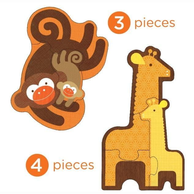 Sestavljanka, ki lahko raste skupaj z vašim otrokom, vsebuje štiri sestavljanke različnih težavnostnih stopenj. Pakirane so v priročni škatli iz recikliranega kartona z ročajemiz vrvice. Glavneznačilnosti: 4 živali, skupaj 18 delov (3–6 delov sestavljanke)praktično pakiranje