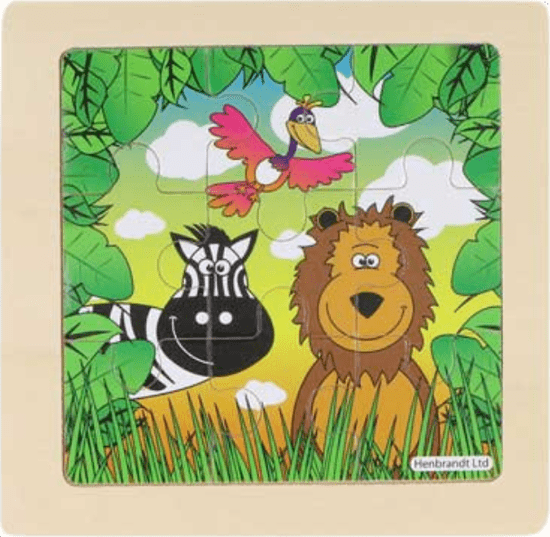 Otroške uganke iz lesa. Sestavljanke so položene na leseno osnovno ploščo z izrezanim robom za lažje zlaganje. Sestavljanka razvija domišljijo in spodbuja razvoj motoričnih sposobnosti. Velikost zložene sestavljanke približno 9 × 9 cm