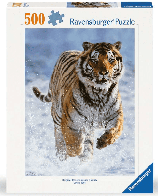 500-delna Ravensburger sestavljanka z vrhunsko tehnologijo SoftClick in motivom mogočnega tigra, ki se sprehaja skozi zasnežene pokrajine svojega naravnega okolja.