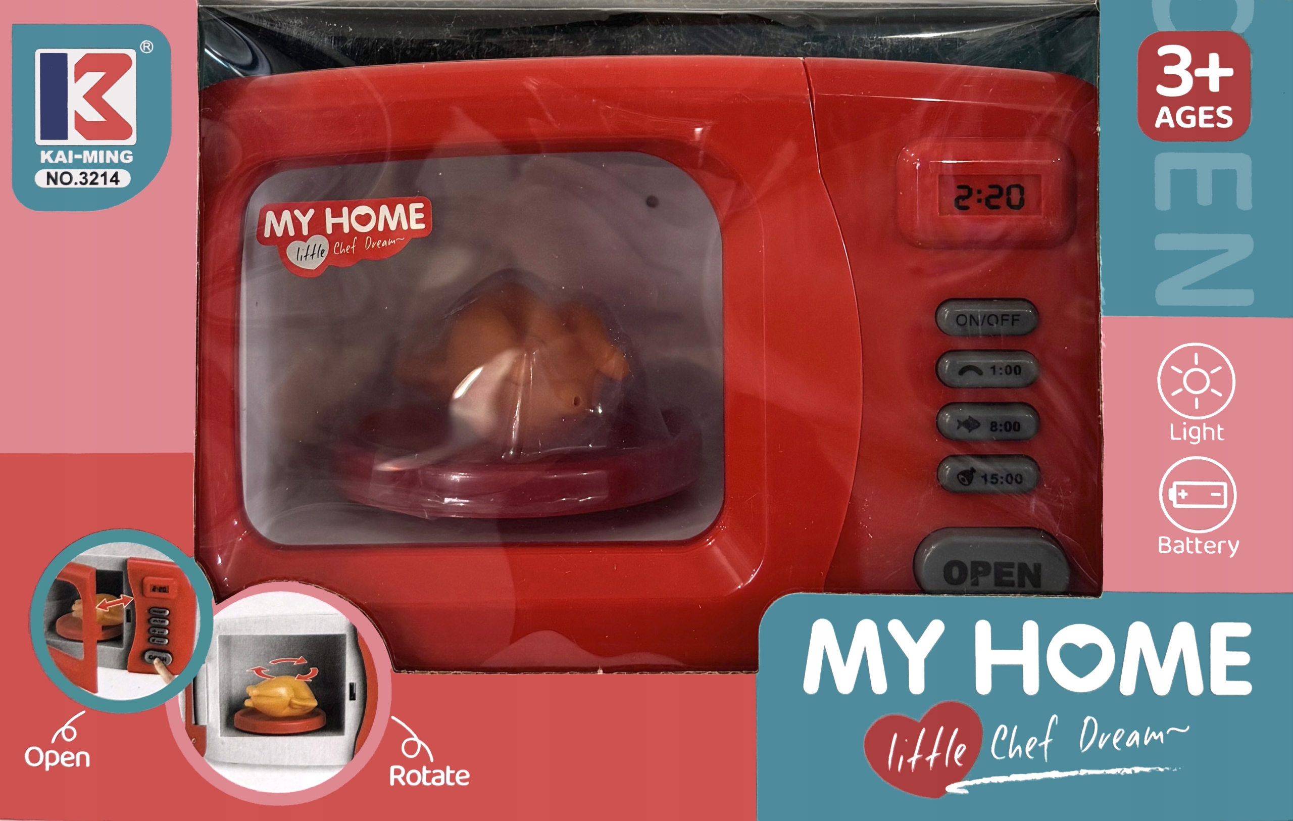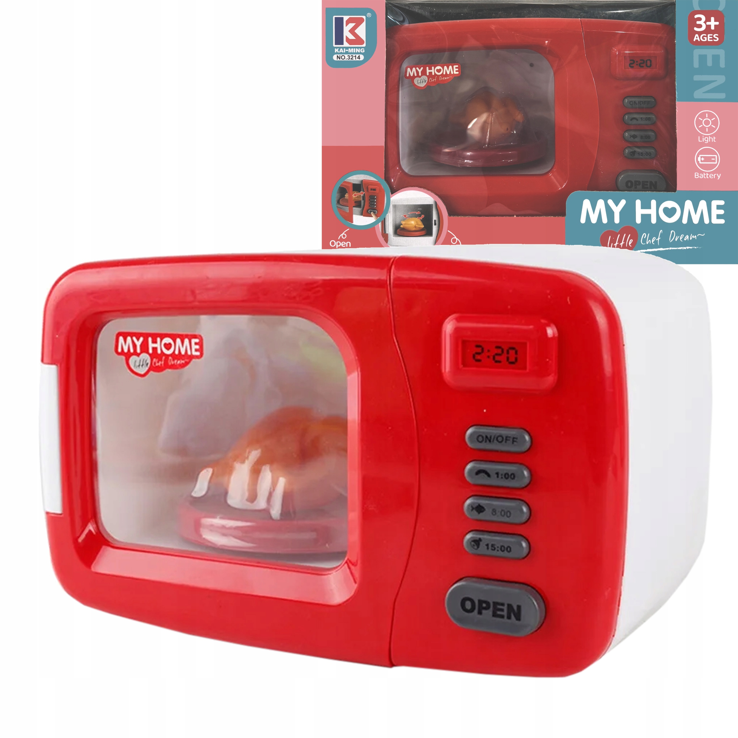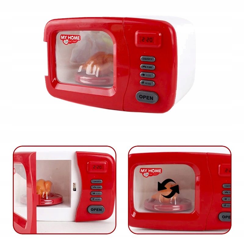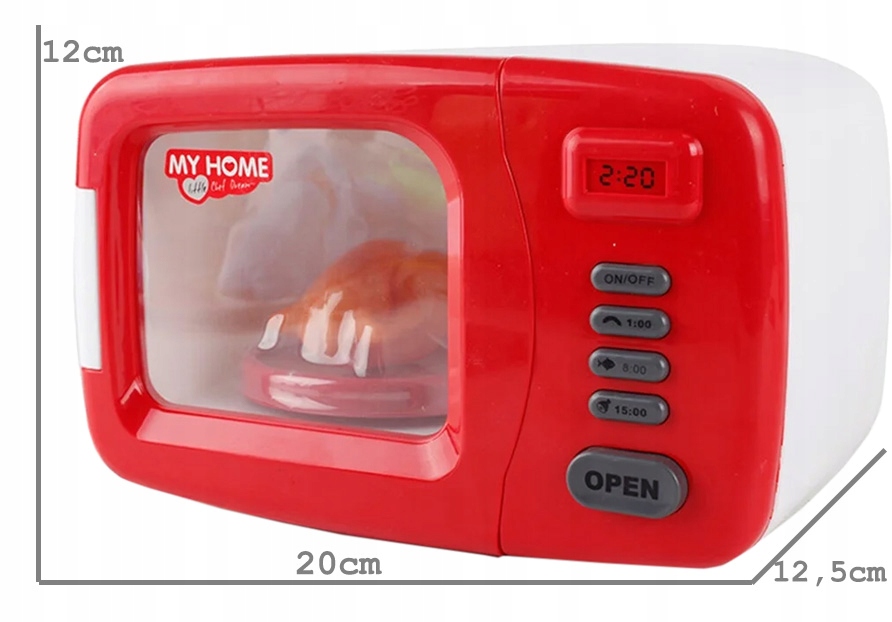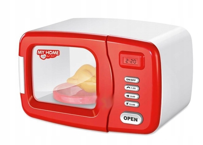 Mikrovalovna pečica je popolna reprodukcija prave naprave, zahvaljujoč njej se lahko vaš otrok varno igra hišo . Dodaten dodatek v obliki snemljivega pečenega piščanca bo zagotovo povečal privlačnost med igro. Igrača ima varnostna certifikata CE in EN71 , ki potrjujeta našo skrb za varnost vseh otrok. Izdelana je bila z največjo skrbnostjo, zaradi česar popolnoma posnema prave gospodinjske aparate.