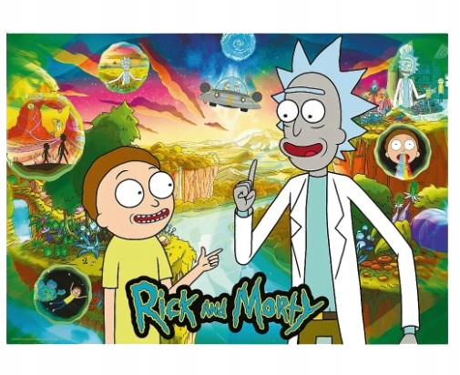 Uganke Rick in Morty prikazujejo nepozaben prizor iz animirane serije. Ko so sestavljene, bo ustvarjena slika velikosti 683 × 480 mm.