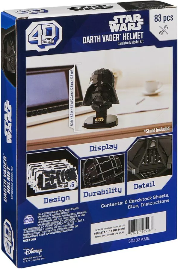 Za ljubitelje Vojne zvezd – ta 4D model čelade Dartha Vaderja kar kliče po tem, da bi bil razstavljen na vaši polici! Podajte se na epsko pustolovščino z našim modelom filmske kakovosti iz sveta Vojne zvezd. Ta komplet za sestavljanje 4D vsebuje vse podrobnosti filmske kakovosti, ki jih poznate iz filmov, ter lepilo in stojalo! Dobili boste 6 plošč s 83 odstranljivimi deli in enostavna navodila za sestavljanje. Orodje ni potrebno! Velikost čelade je 13,3 × 12,5 × 17,6 cm. Odlična dekoracija za spalnico, igralnico ali kot dekoracija za rojstnodnevno zabavo na temo Vojne zvezd – ponosno pokažite svojo čelado. Za nove mlade oboževalce Vojne zvezd – ta sestavljanka je odlično darilo za vsakega najstniškega superfana. Za odrasle oboževalce izvirnih likov iz Vojne zvezd pa je tudi popolna igrača. Ne glede na to, ali imate radi svetlobne meče, Mandalorijance, Baby Yodo ali Boba Fetta, je ta 4D čelada Darth Vader za vas. Oglejte si več modelov iz Vojne zvezd za najstnike od 14 let naprej. Sestavljiva sestavljanka 4D je tudi fantastično rojstnodnevno darilo za moškega in darilo zanj! Izvlecite svoj svetlobni meč za akcijsko zabavo in začnite graditi!
