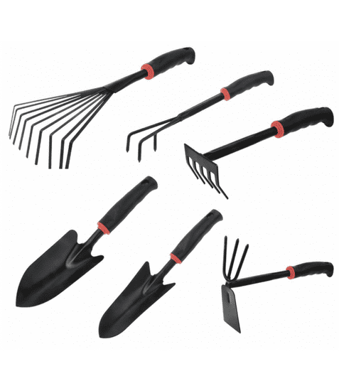 Komplet 6 izjemno uporabnih vrtnarskih pripomočkov. Je prava obvezna oprema vsakega samospoštljivega vrtnarja in vrtnarja Komplet vsebuje dve vrtni lopati, grablje in vrtnarske kremplje, motiko s kremplji in grablje za metlo. Orodja so kompaktna in zavzamejo malo prostora, hkrati pa so izjemno funkcionalna in bodo delovala tako dobro kot primerki v polni velikosti. Udobni, ergonomski ročaji iz mehke plastike zagotavljajo veliko udobje pri uporabi.