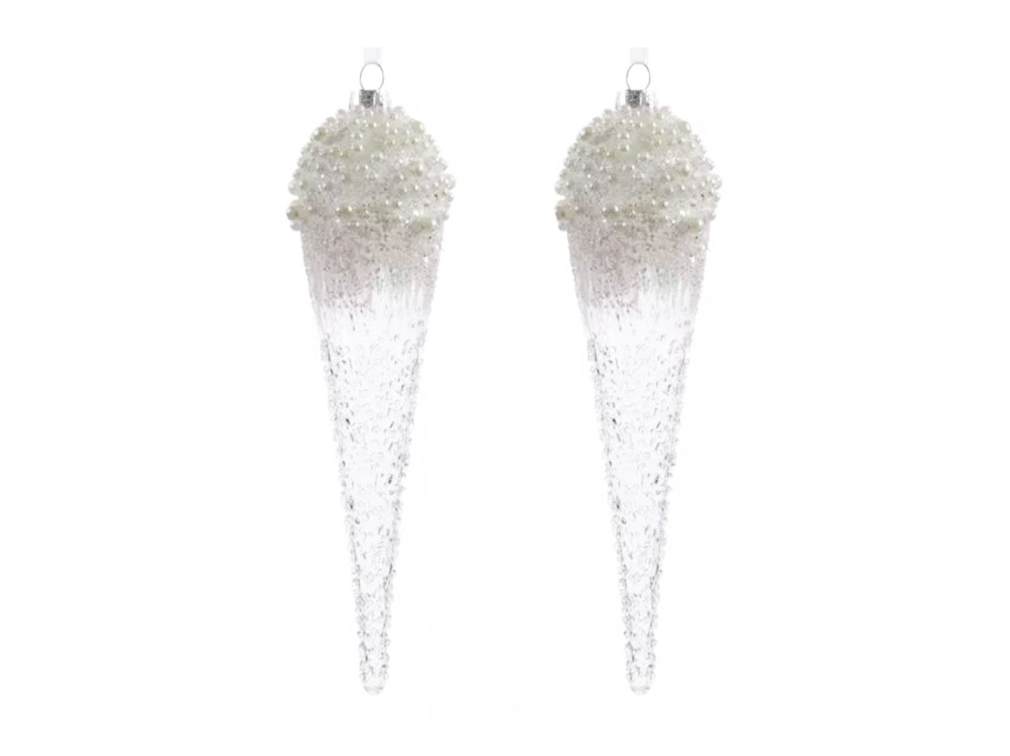 Komplet 2 okraskov v obliki steklenih ledenk z bisernim okrasom.