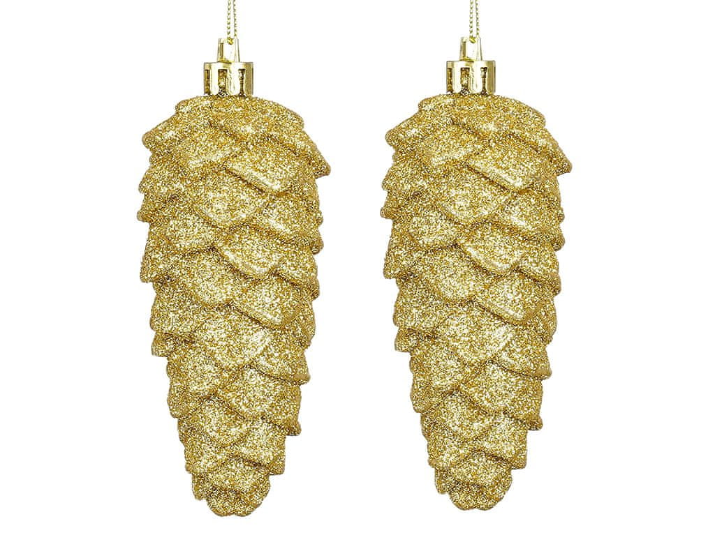 Komplet 2 večjih okraskov v zlati barvi z motivom borovega stožca.