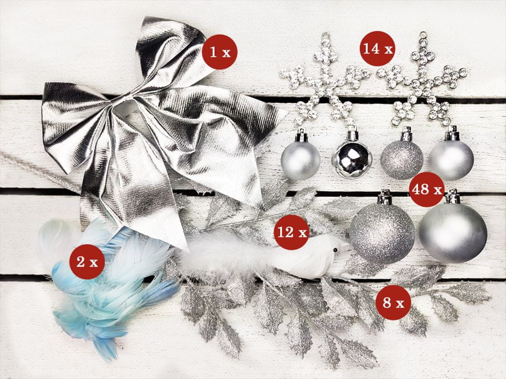 Komplet okraskov sestavljajo številni čudoviti in nežni okraski, kot so: ptice, zvezdice ali srebrni listi.