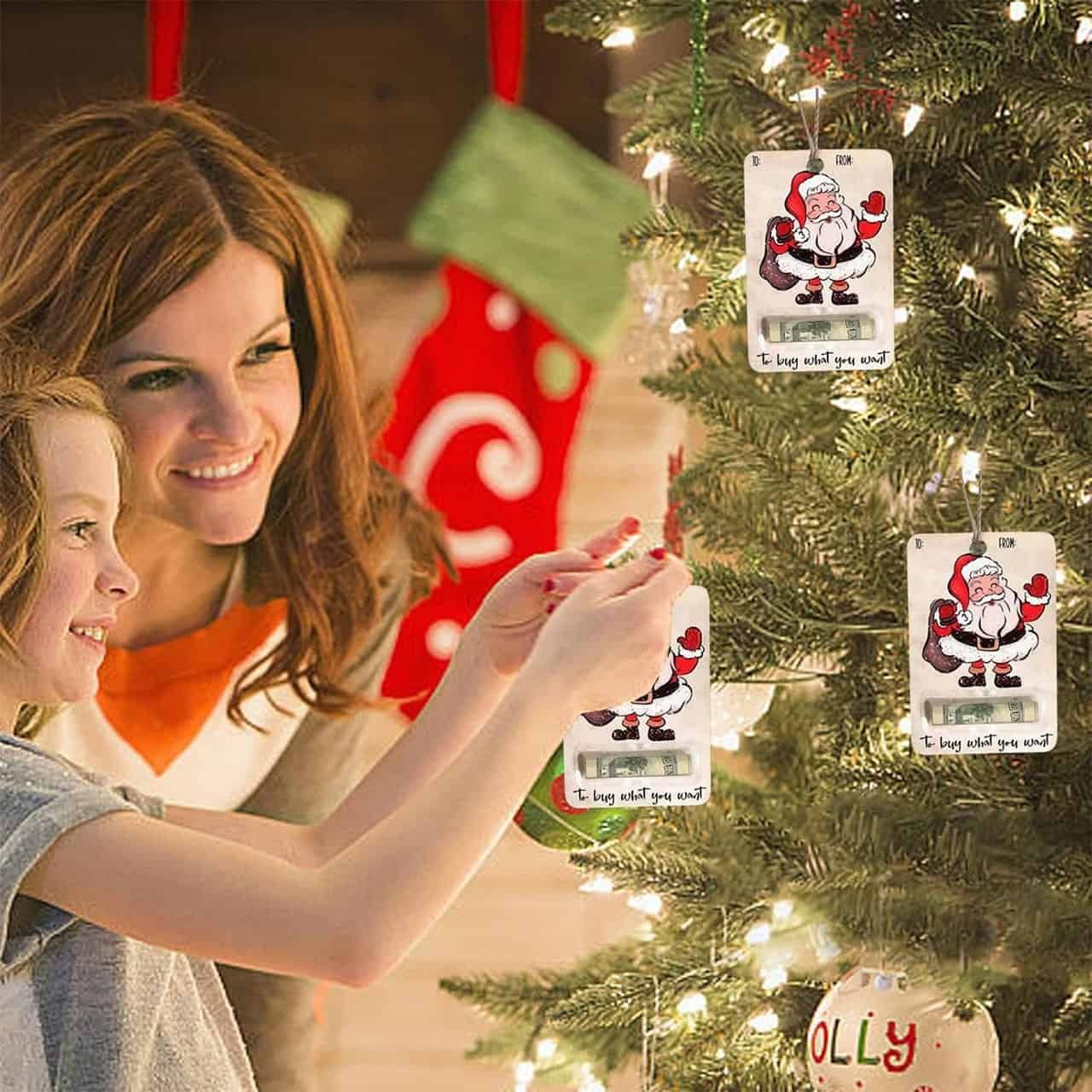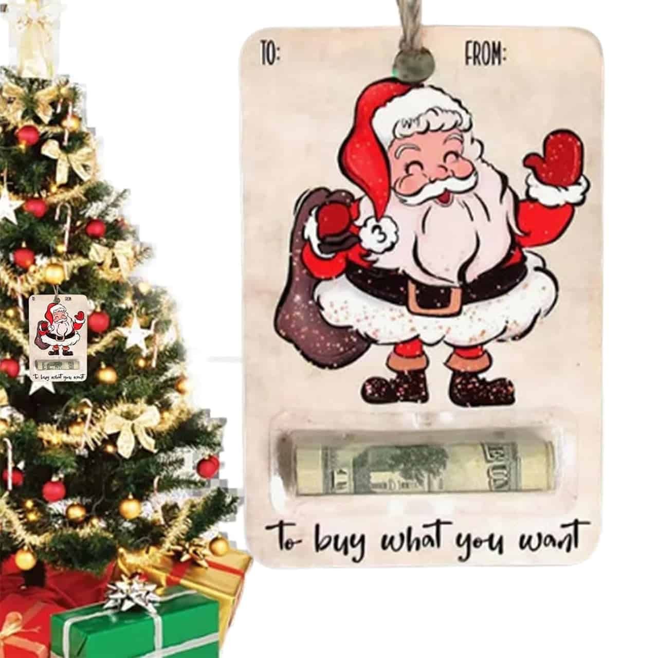 Netscroll Personaliziran božični obesek s predelom za denar (3 kosi), unikatna božična kartica, obesek za božično smreko, držalo za denar za božično drevo, unikatno božično darilo, naravni les, BestGift