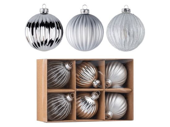 Set 6 steklenih kroglic za božično drevo s premerom 80 mm. Kroglice so v mešanici barv – prozorne z bleščicami, srebrne in sive, kar ustvarja eleganten in brezčasen videz.