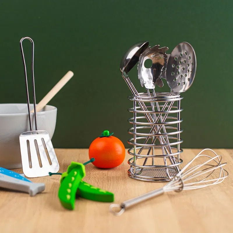 S pomočjo kompleta kuhinjskih pripomočkov bosta kuhanje in peka enostavna! Komplet, namenjen malim kuharjem in kuharicam, vsebuje šest otrokom prijaznih pripomočkov, vključno z obračalnikom, režnato žlico, zajemalko, metlico, zajemalko za špagete in kuhalnico, ki so shranjeni v priročni valjasti posodi. Otroci lahko stepajo, mešajo in servirajo ter preizkušajo različne kuhinjske dejavnosti, s katerimi spodbujajo svojo ustvarjalnost. Igra vlog je odličen način za razvijanje socialne inteligence, jezikovnih spretnosti, ustvarjalnega razmišljanja in komunikacijskih spretnosti. Ravnanje s kuhinjskimi pripomočki izboljšuje fino motoriko in koordinacijo roka-oko. Pripomočki so izdelani iz vrhunskih kakovostnih materialov iz odgovornih virov in pobarvani z nestrupenimi barvami in laki. Ustrezajo veljavnim evropskim varnostnim standardom. Glavne značilnosti: 6 kuhinjskih pripomočkov v posodi: obračalka, perforirana žlica, zajemalka, metlica, zajemalka za špagete in kuhalnicarazvija socialno inteligenco, jezikovne spretnosti, ustvarjalno mišljenje in komunikacijske spretnostiizboljšuje fino motoriko in koordinacijo rok in očispodbuja igro vlogNarejen iz visoko kakovostnih materialovPrimeren za starost od 3 let