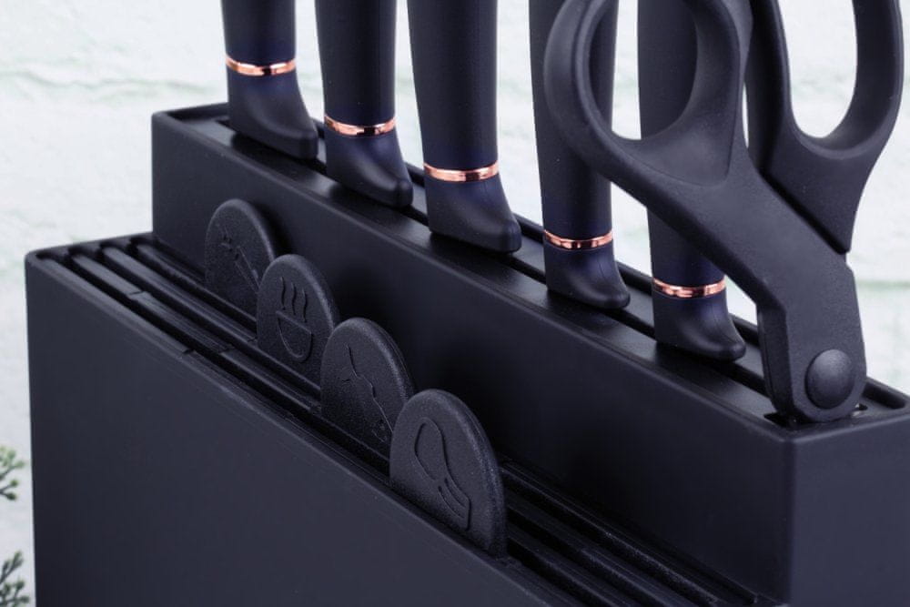 Set nožev in desk za rezanje, ki so priročno nameščeni v stojalu iz kolekcije Black Rose. V kompletu je 5 najpogosteje uporabljenih kuhinjskih nožev in 4 deske za rezanje. Noži iz nerjavečega jekla so prevlečeni z nelepljivo antibakterijsko površino, ki je nežna do hrane, poleg tega se med rezanjem nič ne prilepi na nože. Ergonomsko oblikovan ročaj ima na dotik mehko površino, ki je nedrseča, nož je zelo udoben v roki in ne zdrsne. Vse deske za rezanje so lepo vstavljene v sprednji del stojala. Noži so nameščeni v zadnji reži, zato je vse sestavne dele kompleta enostavno odstraniti in vrniti v stojalo.