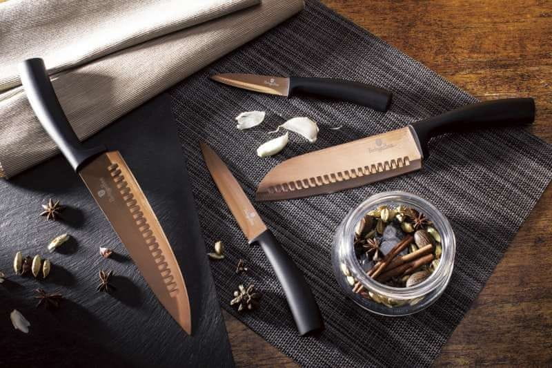 • Material: nerjavno jeklo s titanovo nelepljivo površino- kuharski nož 20 cm- nož Santoku 17,5 cm- kuhinjski nož 12,5 cm- nož za obrezovanje 9 cm- barva: črno-rožnata-zlata roza zlata- rezila iz …