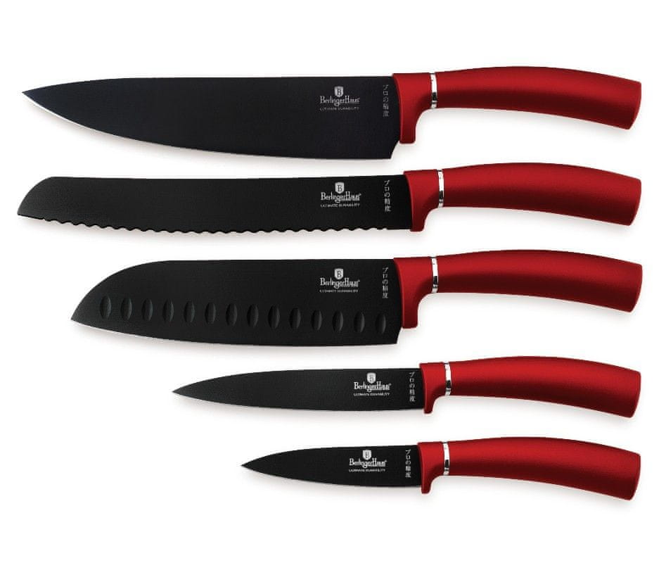Set najpogosteje uporabljenih kuhinjskih nožev iz kolekcije Burgundy Metallic Line v kombinaciji črne in rdeče barve. Poleg tega je s priročnim magnetnim stenskim ali stenskim nosilcem, na katerem bodo noži vedno lahko nabrusili nelepljive nože standardno z brusilnim kamnom, brusilnikom ali na brusilnem kamnu, tako kot ste kot ste vajeni pri običajnih nožih.