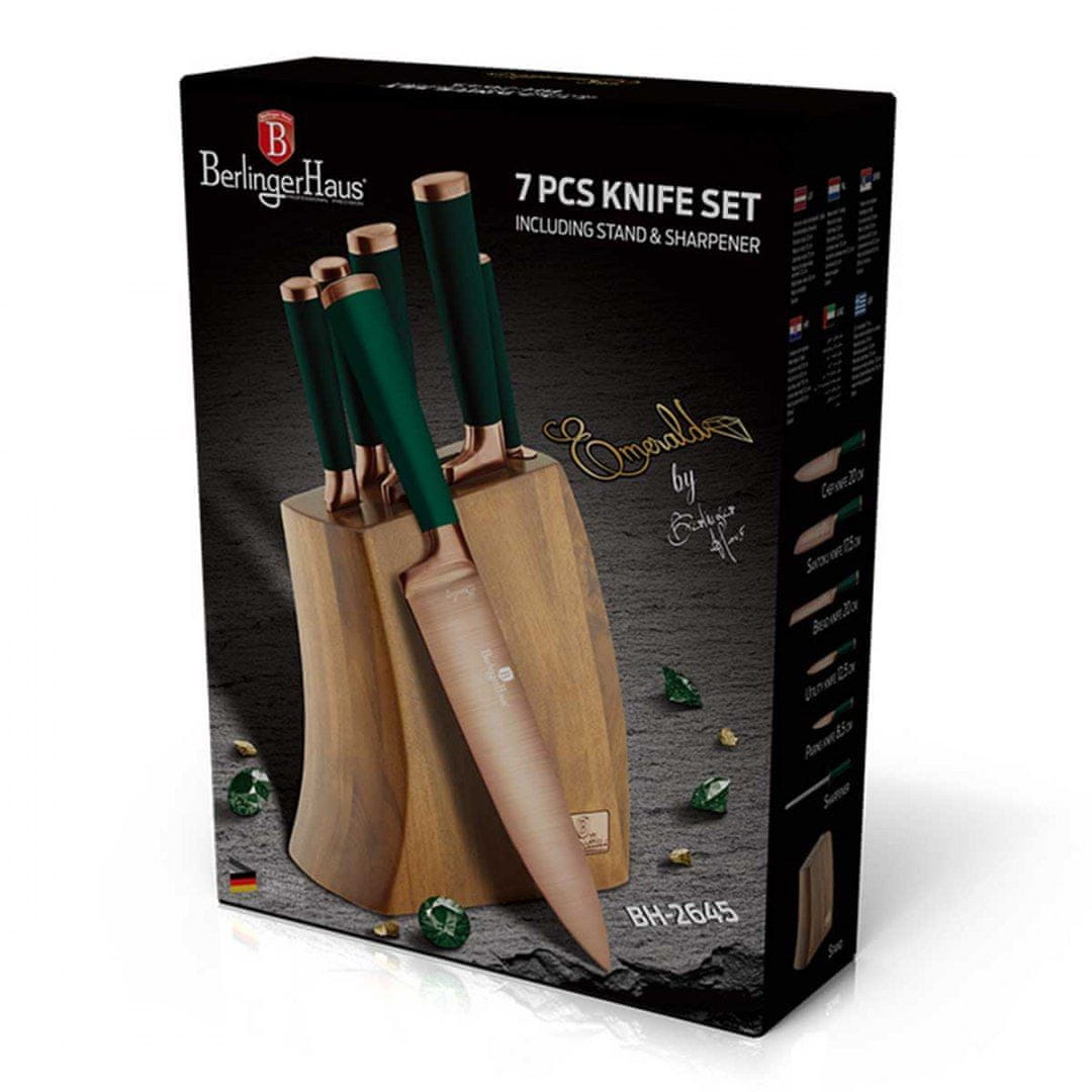 7-delni set nožev podjetja BERLINGER HAUS iz serije Emerald, namenjen za porcijo mesa in rib, rezanje kruha ter lupljenje in sekanje zelenjave. Noži iz visoko kakovostnega nerjavečega jekla Ferrinox 18/10 z visoko vsebnostjo ogljika 1,4028 / X30Cr13. Pomembna lastnost tega jekla je dejstvo, da je odporno na vse vrste prask, prask, zanj pa je značilna povečana odpornost proti obrabi in koroziji. Rezila iz brušenega bakra. Noži v trdnem lesenem bloku. Celoten komplet je originalni dekorativni element v vsaki kuhinji, ki vsebuje vse potrebne nože za vsakodnevno pripravo obrokov.