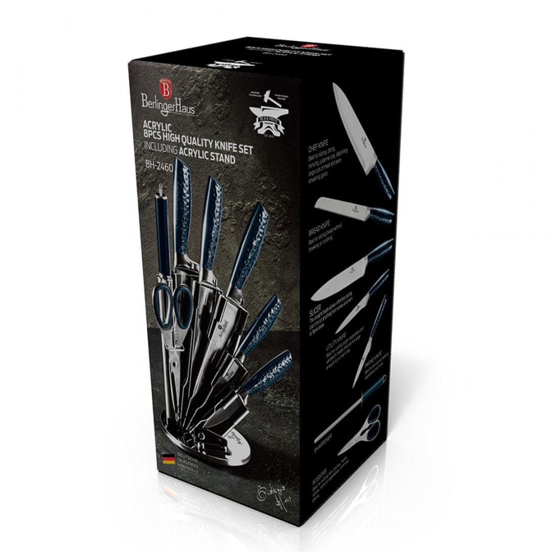 8-delni komplet nožev na stojalu podjetja BERLINGER HAUS iz serije AQUAMARINE COLLECTION. Zasnovan je za porcioniranje mesa in rib, rezanje kruha ter lupljenje in sekljanje zelenjave. Noži so izdelani iz visokokakovostnega nerjavečega jekla Ferrinox 18/10 z visoko vsebnostjo ogljika 1.4028/X30Cr13. Pomembna lastnost tega jekla je, da je odporno na vse vrste prask, obrabo in korozijo. Rezilo je izdelano iz krom-molibdenovega jekla, ki je izredno trdo, odporno na deformacije in dovzetno za brušenje. Nož je izdelan v skladu s tradicionalno umetnostjo iz enega samega kosa jekla. Prehod med rezilom in ročajem je brezhiben. Ročaji so ergonomsko oblikovani in omogočajo varen oprijem brez drsenja.