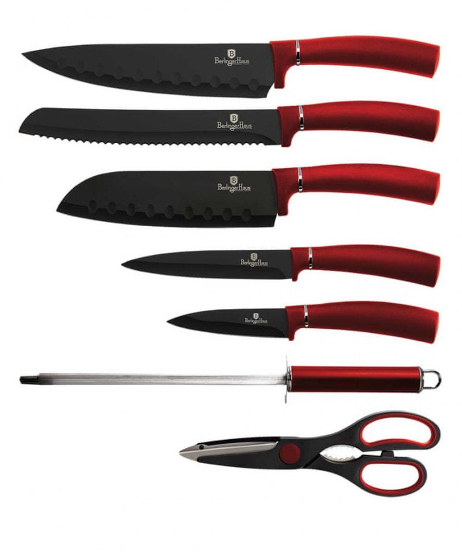 8-delni set nožev na stojalu proizvajalca BERLINGER HAUS iz serije Burgundy Metallic. Zasnovan je za porcioniranje mesa in rib, rezanje kruha ter lupljenje in sekljanje zelenjave. Noži iz nerjavečega jekla so dodatno prevlečeni s premazom proti sprijemanju. Ročaji z zelo trpežno tanko nedrsečo prevleko zagotavljajo varen oprijem v vseh razmerah.