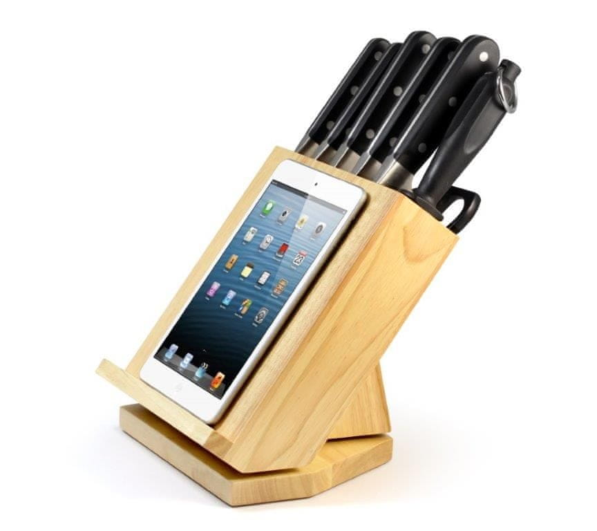 - material: nerjavno jeklo / les- stojalo se vrti za 360° – ena stran stojala za tablični računalnik, mobilni telefon ali kuharsko knjigo- komplet vsebuje:1× kuharski nož 20 cm1× nož za pecivo 20 cm1× nož za rezljanje 20 cm1× nož za zelenjavo …