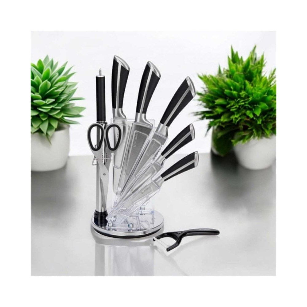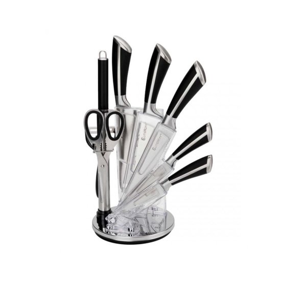 Ta 9-delni komplet kuhinjskih nožev v vrtljivem akrilnem stojalu v obliki pahljače je popolna in elegantna izbira za vsako kuhinjo, ki olajša vsakodnevno pripravo obrokov. Komplet vključuje različne nože za različna kuhinjska opravila – od rezanja kruha, mesa do sekljanja zelenjave, pa tudi brusilnik in škarje, ki izboljšujejo njegovo funkcionalnost.