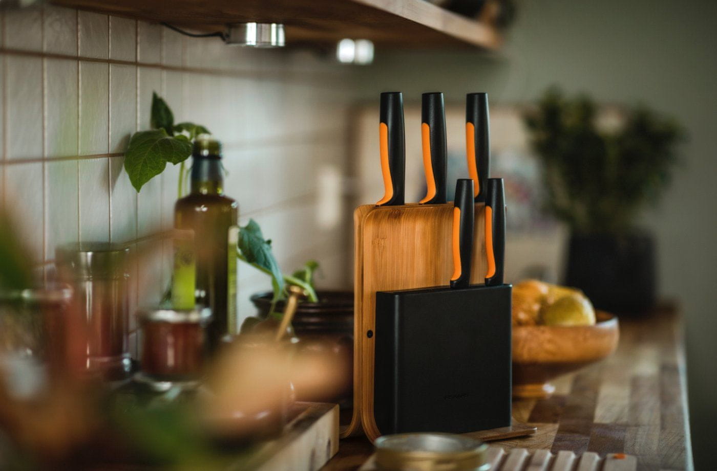 Čudovit oblikovalski blok s petimi noži Fiskars iz serije Functional Form iz bambusa in plastike. Celoten opis