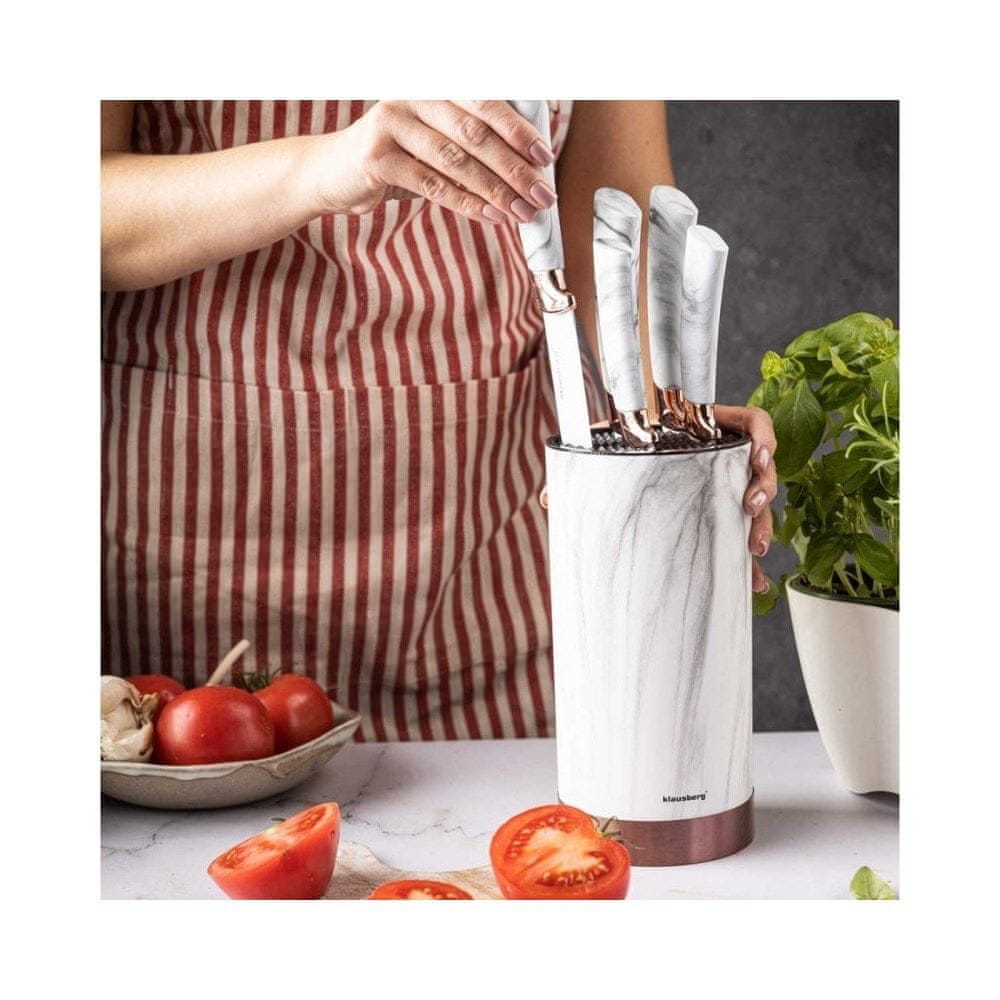 Komplet 5 kuhinjskih nožev v stojalu. Imitacija belega marmorja.