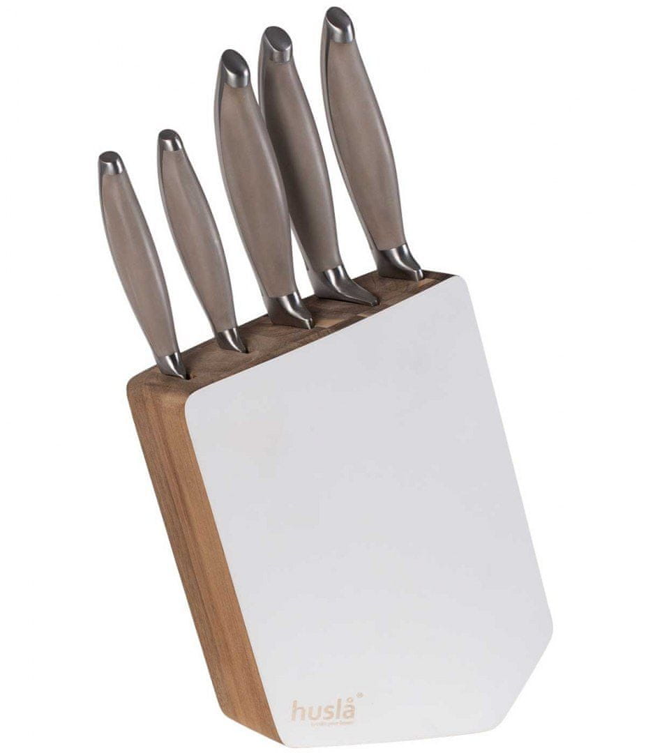 Čudovit akacijev blok, obarvan belo ob straneh, in komplet 5 nožev iz zelo kakovostnega, debelega nerjavečega jekla navdušijo s svojo eleganco in trdnostjo na prvi pogled. Umetna masa v ročajih nožev v nežno sivi barvi daje našemu izdelku toplo podobo. Zahvaljujoč temu se odlično počuti v vsaki kuhinjski notranjosti, še posebej na prevleki nahrbtnika in posod za kavo / čaj / sladkor naše blagovne znamke „Husla“.