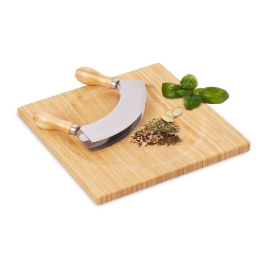 Bambusova deska za rezanje z dvojnim rezalnim nožem obogati vaše kulinarične stvaritve z učinkovitim sekljanjem svežih zelišč in sprosti njihovo polno aromo.