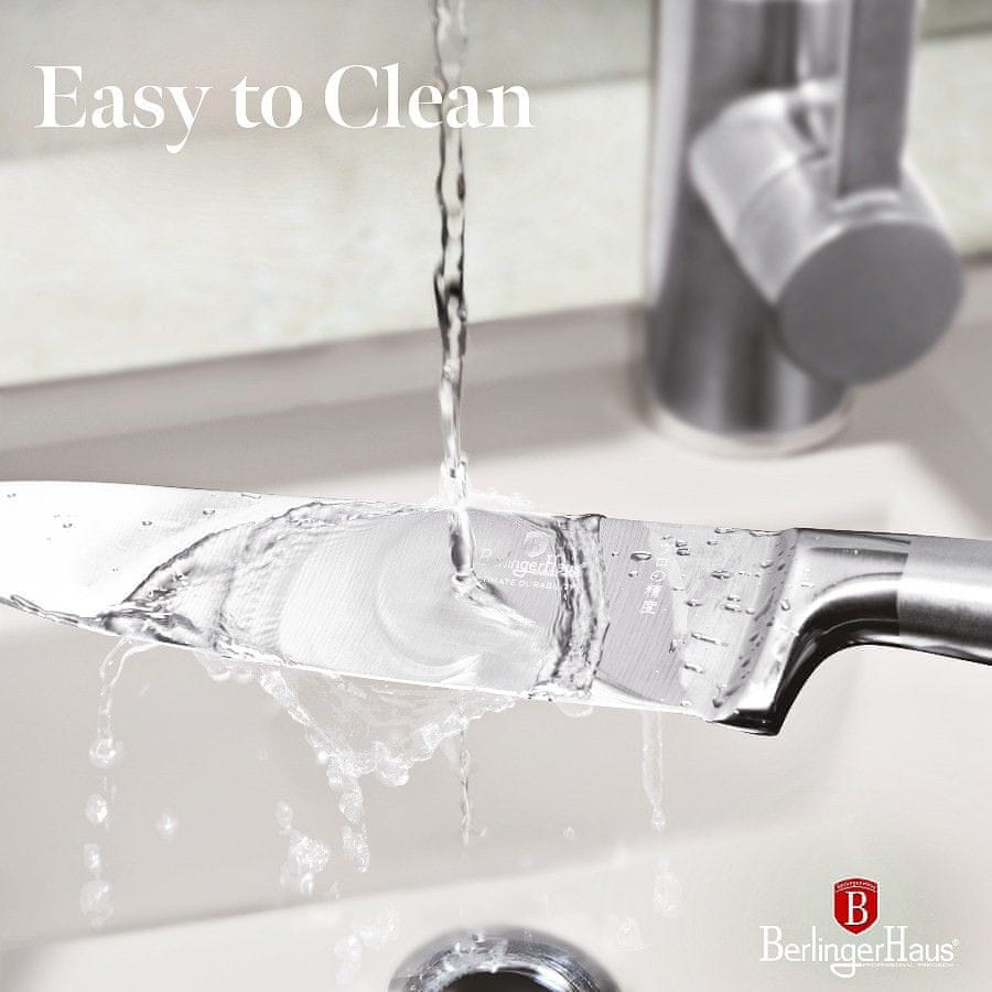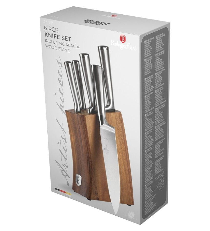 Set Berlingerhaus Antracit sestavlja pet nožev in stojalo iz akacijevega lesa. Rezila so ročno nabrušena in toplotno obdelana. Ročaj je opremljen tudi z varovalom za prste, ki preprečuje, da bi se med rezanjem porezali na notranji strani rezila.