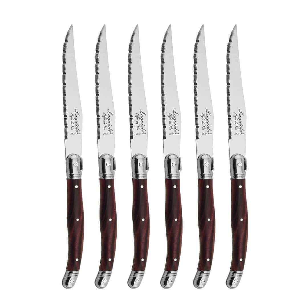 6-delni komplet nožev za zrezke iz serije Premium Line združuje eleganco, vsestranskost in praktičnost. Vsak nož ima 11 cm dolgo nazobčano rezilo iz kakovostnega nerjavečega jekla debeline 1,8 mm, ki omogoča enostavno rezanje sočnih zrezkov, mesa z žara, pa tudi pice ali drugih jedi z hrustljavo skorjico. Plastični ročaji v temno rjavi barvi v imitacij lesa poskrbijo za udoben oprijem, brezčasna oblika pa doda pridih elegance na vsako mizo. Noži so primerni za pomivanje v pomivalnem stroju. Komplet je shranjen v priročnem lesenem bloku, ki združuje praktičnost in estetsko dovršenost ter predstavlja čudovit dodatek k vaši kuhinji.