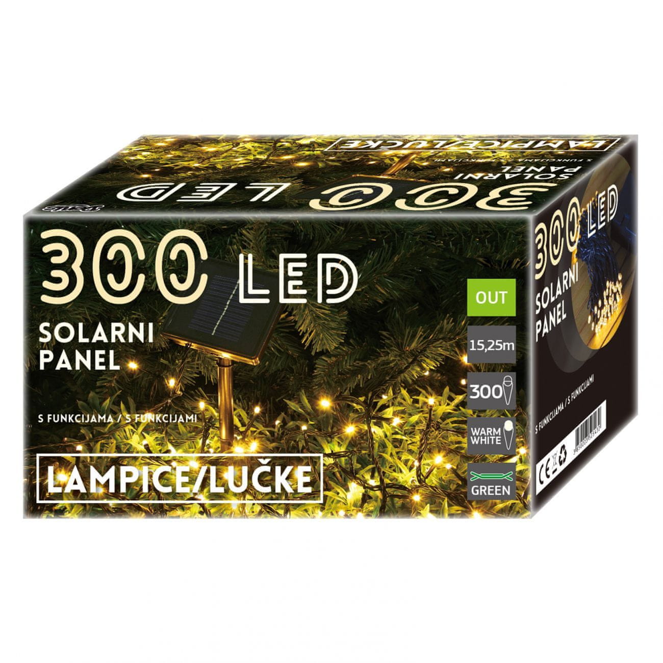 Sončna plošča 300 LED luči na zeleni žici. Svetloba tople bele barve. Dolžina niza svetilk je 14,95 m. Dolžina električnega kabla od prostora za baterije do prve luči je 0,3 m. 8 funkcij. Deluje na baterije: AA Ni-Mh1,2 V1200 mAh. Svetloba sveti približno 6 ur. Celoten opis
