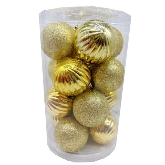 Tip: Začetek in zaključek: Vrsta: božična dekoracija. V kompletu: V kompletu: 16× kroglice. Velikosti: Sklopi: 6 cm. Barve: zlata. Vzorec: z bleščicami in profiliran. Material: plastika. Celoten opis