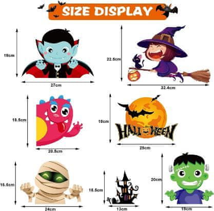 Nalepke za noč čarovnic iz dvostranskega PVC materiala so varne, okolju prijazne in za večkratno uporabo. Z motivi, kot so čarovnice, vampirji, buče in več, so idealne za okrasitev oken, vrat in drugih gladkih površin. Enostavne za odstranjevanje brez sledi. Velikost: 21 × 29,5 cm. Celoten opis