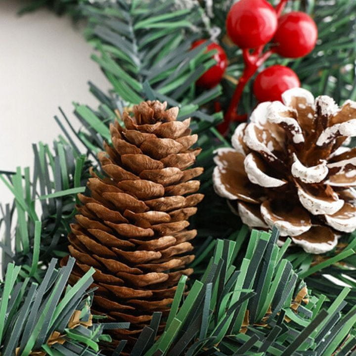 Venec je obogaten z drobnimi prazničnimi okraski, kot so storži in subtilni dodatki, ki poudarijo njegov poseben značaj.