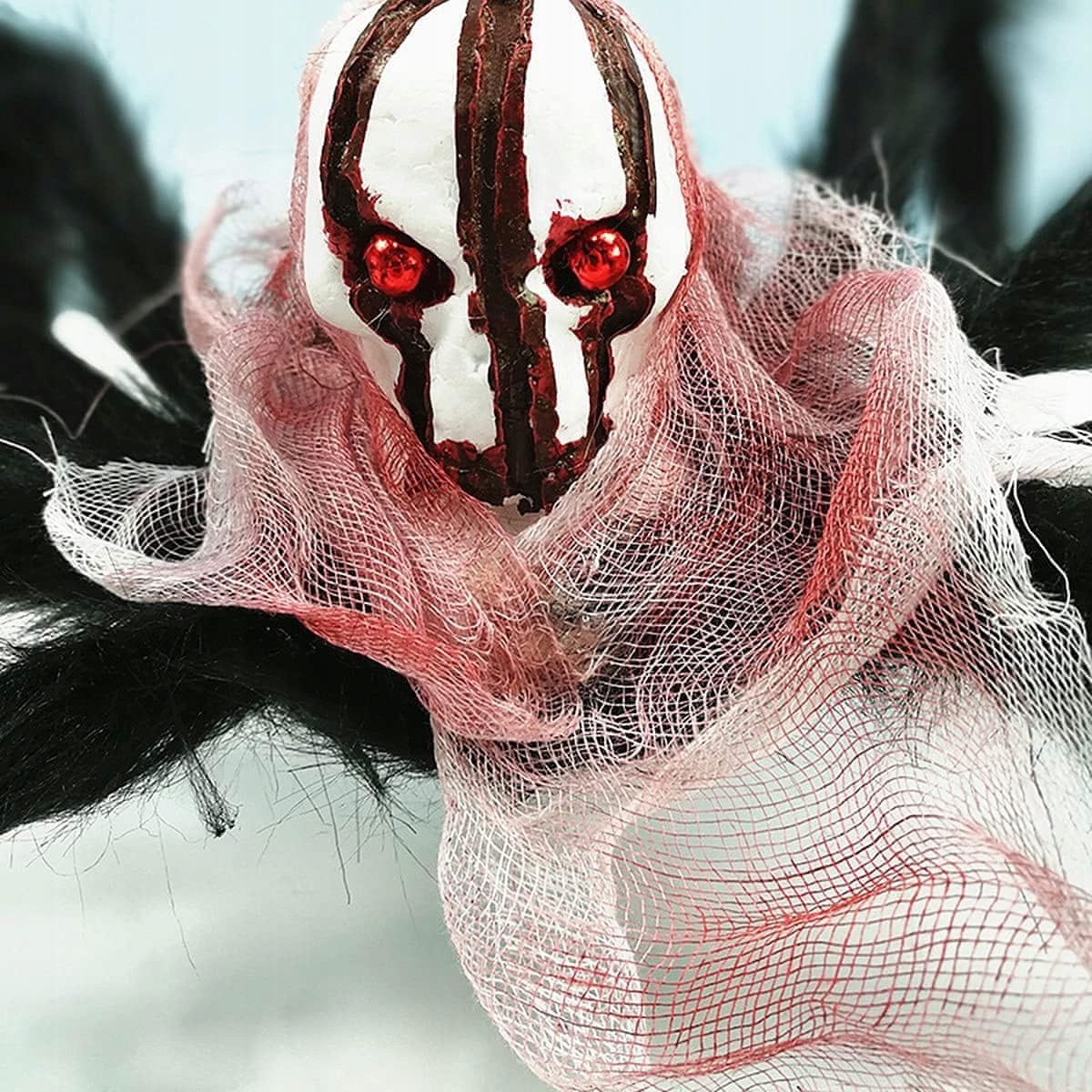 Pajek je izdelan iz kakovostnega umetnega materiala, kar mu daje realističen videz z dlakavimi nogami in glavo v obliki lobanje, kar dodatno okrepi grozo, ki jo prinaša. Rdeč plašč, ki je ovit okoli njegove glave, dodaja element grozljivosti in zagotavlja, da postane osrednji kos vaše dekoracije ob Noči čarovnic.