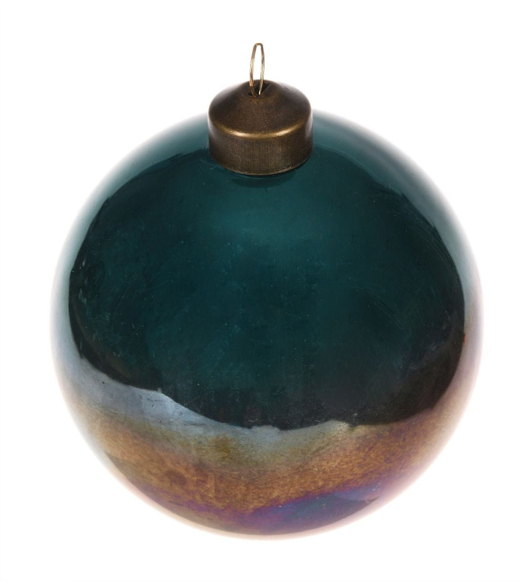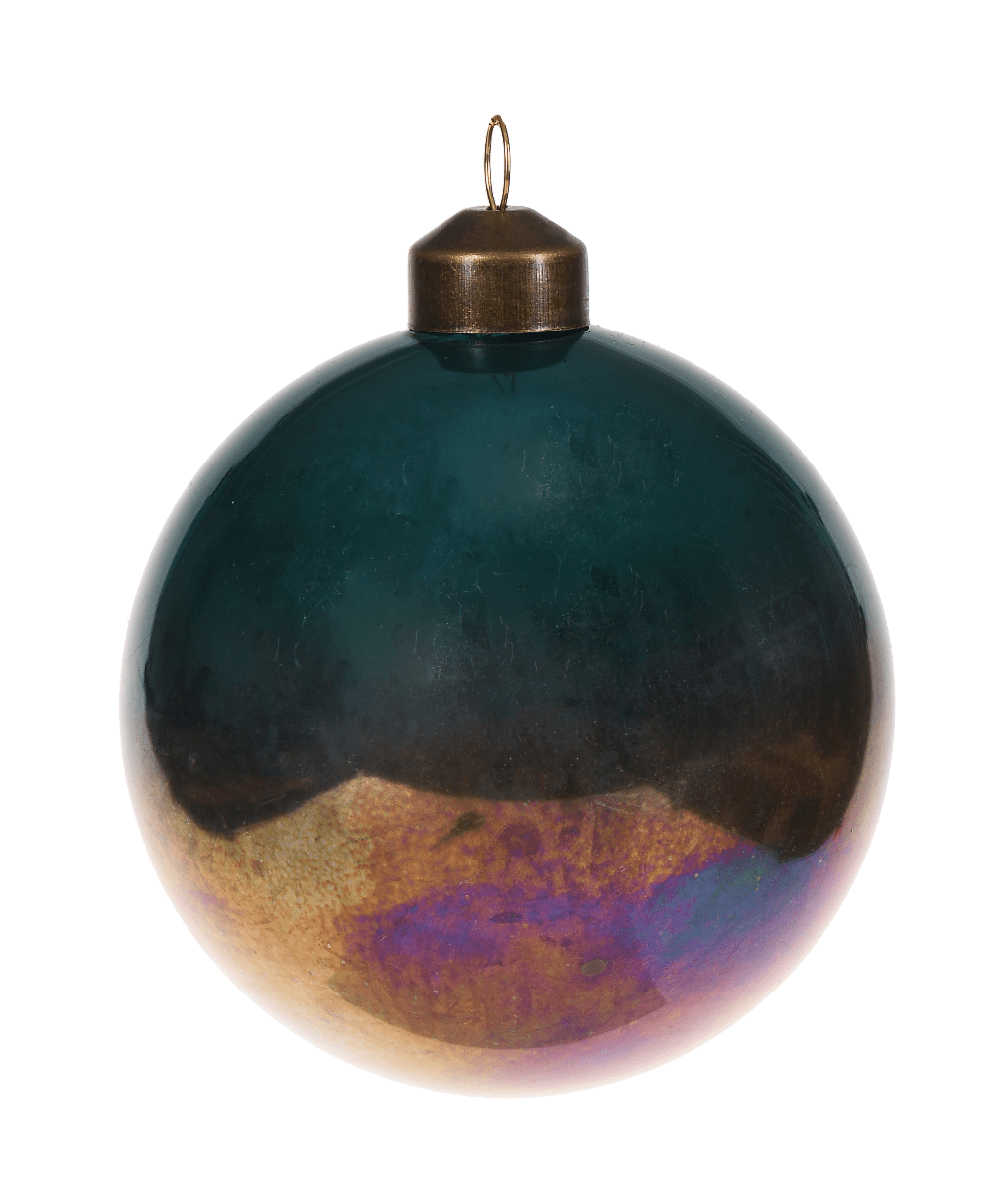 Okrogla igrača iz nežnega stekla. Obarvana v temno modro in obogatena z učinkom razlitega bencina, v katerem so vidne vse barve. Zaradi edinstvene barvne kombinacije bo ta bombonček pričaral nekaj čarobnosti vašemu božičnemu drevescu. Premer bombončka je 8 cm, zato ga lahko uporabite tudi kot del večjih božičnih aranžmajev. Lahko ga postavite tudi kot samostojno dekoracijo, obešeno na stojalu na komodi ali kaminski polici. Odlično se bo obnesel tudi kot božično darilo.