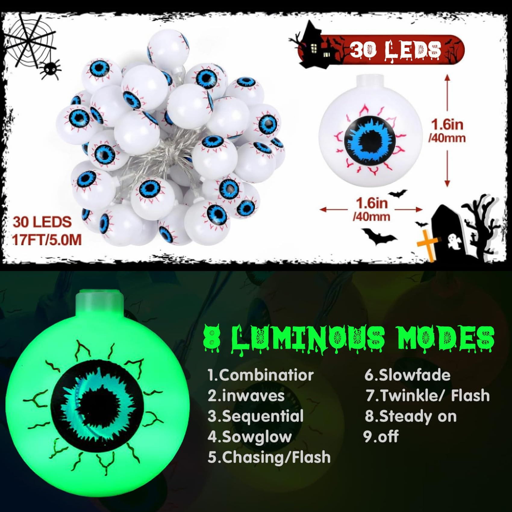 Ta svetlobna veriga je zasnovana posebej za ustvarjanje strašljivega vzdušja med praznovanjem noči čarovnic. S 30 LED diodami, oblikovanimi kot realistična zelena zrkla s krvavimi detajli, je idealna za dekoracijo notranjih in zunanjih prostorov. Zaradi dolžine 5 metrov in napajanja na baterije (3 × AA, niso priložene) omogoča prilagodljivo namestitev brez potrebe po bližini električnih vtičnic. Uporabite jo lahko za okrasitev doma, vrta, balkona ali kot osrednji element zabave za noč čarovnic.