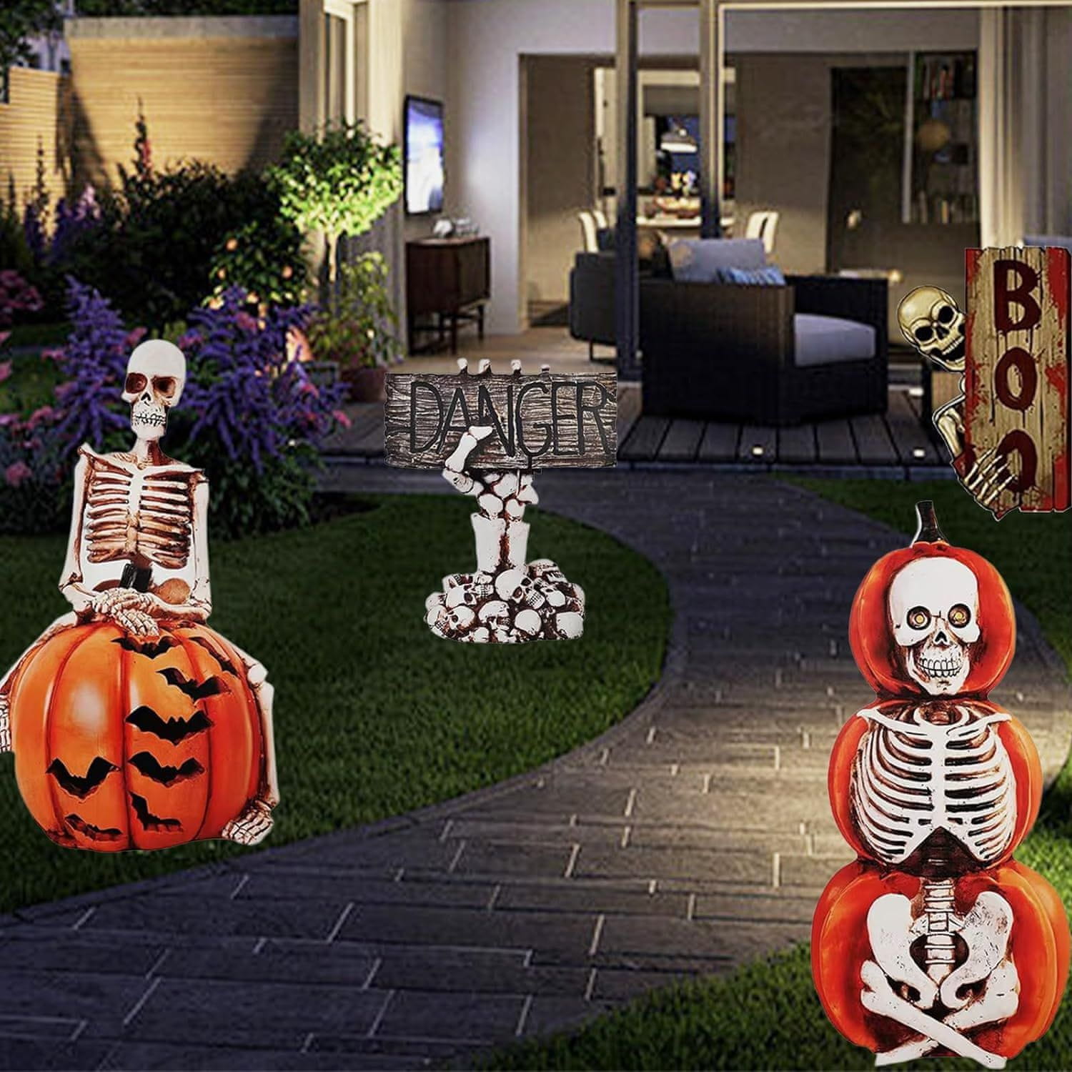 Komplet vrtnih dekoracij za noč čarovnic YIMOJOY je odličen način za ustvarjanje mračnega, atmosferskega prostora okoli hiše. Komplet vključuje 7 elementov z višino do 90 cm, ki predstavljajo inovativen dizajn buče-duha – kombinacijo klasične buče z motivom okostnjaka in duha. Dekoracije takoj pritegnejo pogled in povečajo občutek groze, idealen za zabave za noč čarovnic, igre z otroki ali preprosto kot okras vrta. Vsak element je opremljen s količki za zabadanje v zemljo, kar omogoča hitro in stabilno namestitev na trato, gredico ali ob poti.