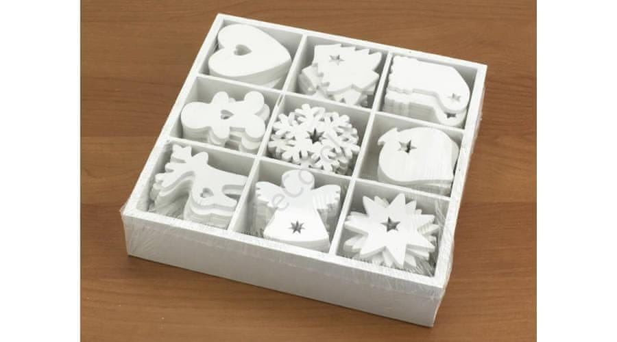 V lični leseni embalaži je 90 kosov različnih lesenih okraskov.