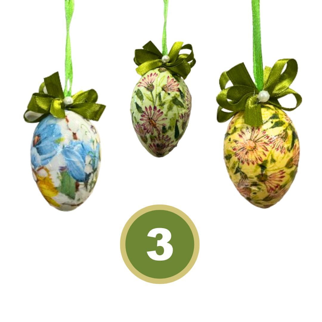 Komplet vsebuje 3 ročno izdelane unikatne pirhe oz. pisanke.