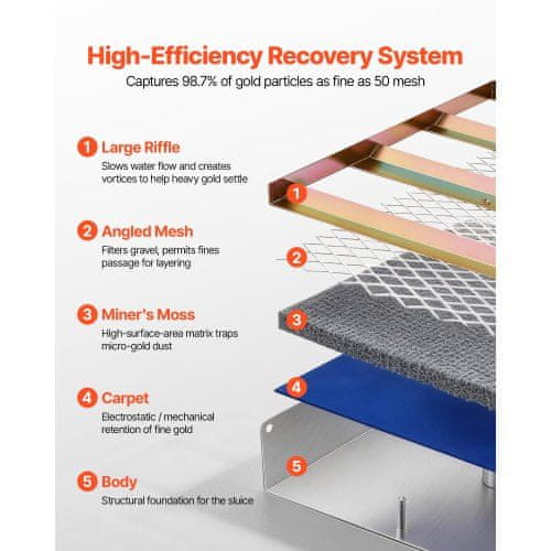 Ta prenosni visokobankar zlata ruda sluice je zasnovan za učinkovito iskanje zlata v različnih okoljih od plitvih potokov do visokih bregov. Njegova dvofunkcijska zasnova omogoča uporabnikom preklapljanje med sluice in visokobankar postavitvami zaradi česar je primeren tako za majhne kot večje serije obdelave. Lahka konstrukcija iz aluminijeve zlitine zagotavlja vzdržljivost in enostaven transport medtem ko vključeni dodatki kot so nahrbtnik z vrvico in zaščitne rokavice povečujejo udobje pri zunanjih avanturah.