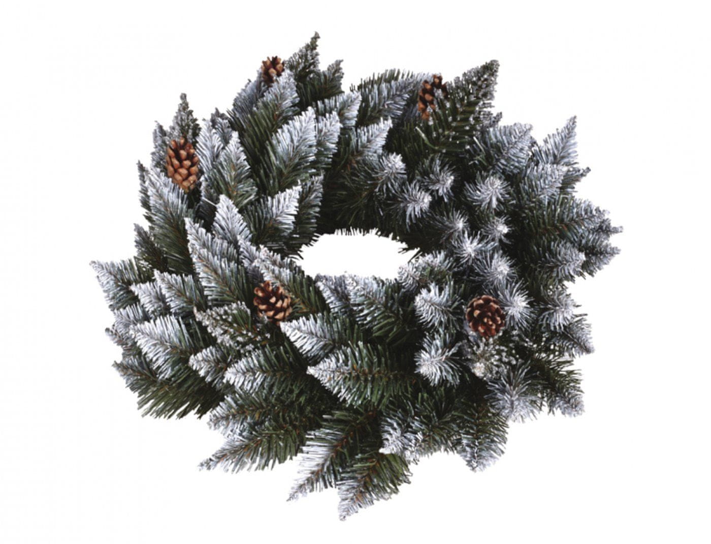 Umetni zimski venec. Veje iglavcev so okrašene z belimi konci in borovimi storži v naravni barvi. Vsestranska uporaba. Primerno za dekoracijo. Okrogla oblika. Premer: 40 cm. Barva: zeleno-bela.