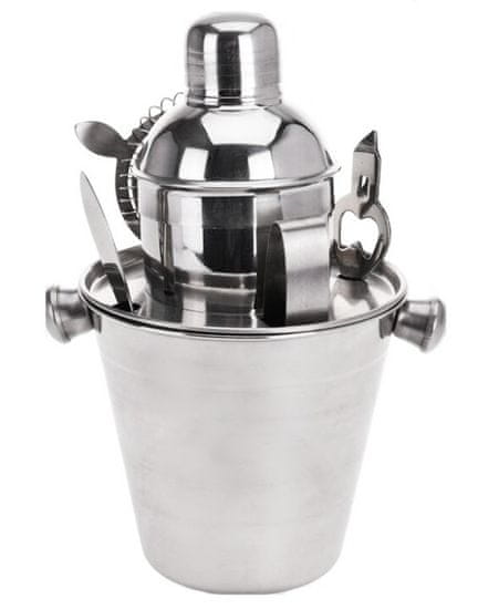 • Material: nerjavno jeklo- komplet vsebuje 7 kosov:- vedro za led- pokrov za vedro / vezivo za shranjevanje v vedru- šejker s pokrovčkom- cedilo- odpirač- nož- klešče za led ali sadje