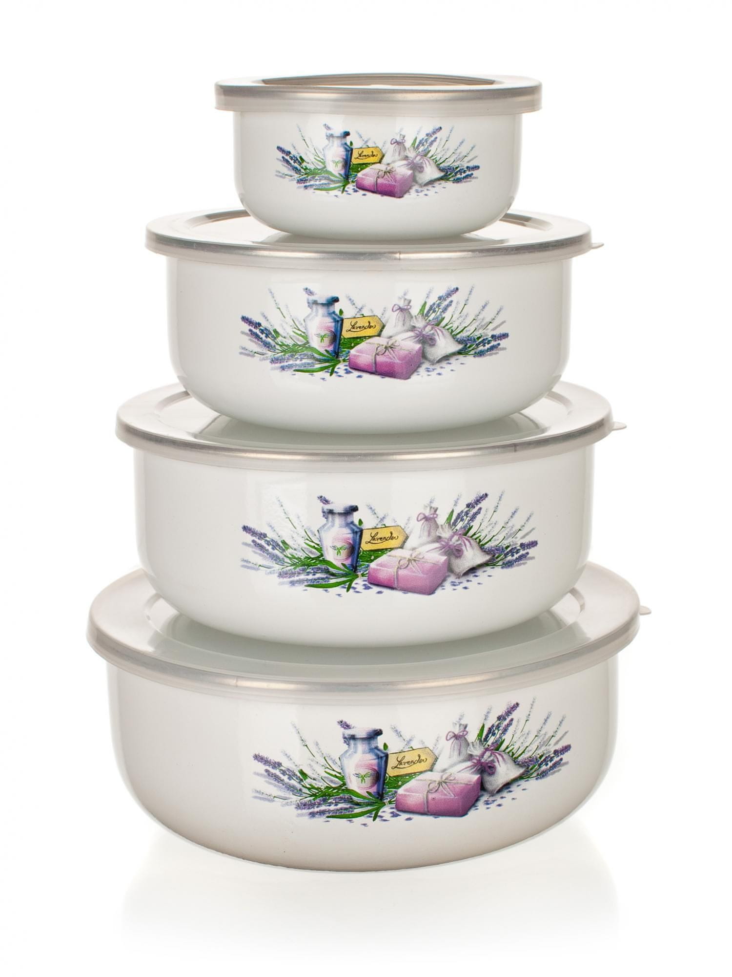 Osemdelni set belih emajliranih skled z okrasom sivke. Praktične skledice so namenjene shranjevanju živil. Opremljene so s pokrovkami iz plastičnega materiala. Set vsebuje skledice s štirimi različnimi premeri. Celoten opis