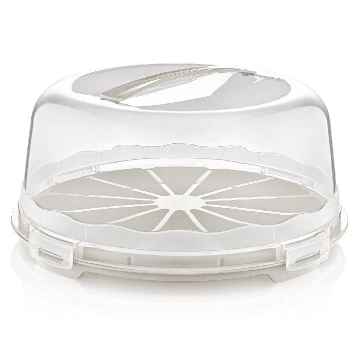 Pladenj s pokrovom za torto ali pito. Pokrov lahko zaprete s sponkami. Zunanji premer 33 cm, spodnji premer pokrova 30,5 cm in višina škatle 15 cm. Škatlo je mogoče pomivati v pomivalnem stroju. Primerna za stik z živili. Barva glede na razpoložljivost na zalogi. EAN 5906485659687 / 8696287303068