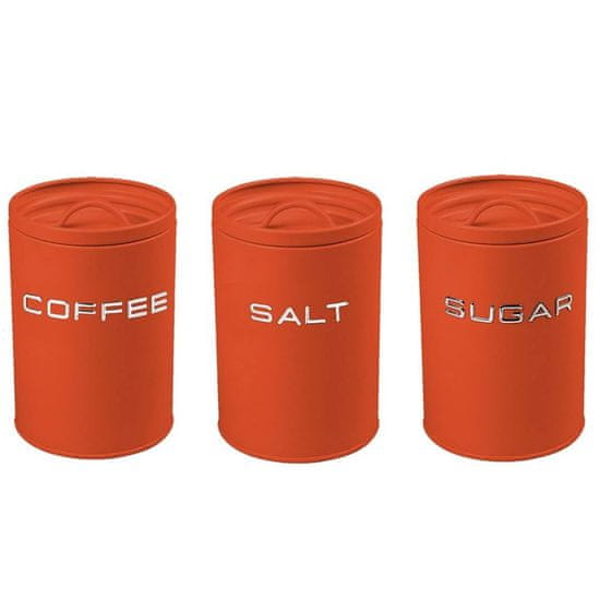 Set treh kovinskih doz oz. posod je primeren za shranjevanje soli, sladkorja in kave. Oranžna barva zagotavlja topel videz, ki se lepo ujema s številnimi kuhinjskimi dekorji. Poudarek na minimalističnem dizajnu pa poudarja preprostost in eleganco, ki se prilega tako sodobnim kot tudi klasičnim kuhinjam. Kromiran napis »Sugar«, »Salt« in »Coffee« na sprednji strani posode je jasen in estetsko oblikovan, kar omogoča enostavno identifikacijo njene vsebine in obenem dopolnjuje celoten videz. Doza je izdelana iz trpežnega kovinskega materiala, ki ohranja vsebino svežo in jo zaščiti pred zunanjimi vplivi, kot so vlaga in zrak. Doze niso primerne za pomivanje v pomivalnem stroju. NAMIG: Dopolnite jih z ostalimi posodami za shranjevanje iz iste linije.