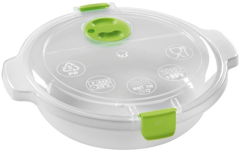 Plastična posoda s prozornim pokrovom je odlična za hitro odmrzovanje, segrevanje in kuhanje v mikrovalovni pečici. Pripravljene jedi lahko shranite v posodi v hladilniku ali zamrznete. Pokrov ima vrtljiv pokrovček za odvajanje pare. prostornina 0,7 l, barva – zelena, modra, taupe.